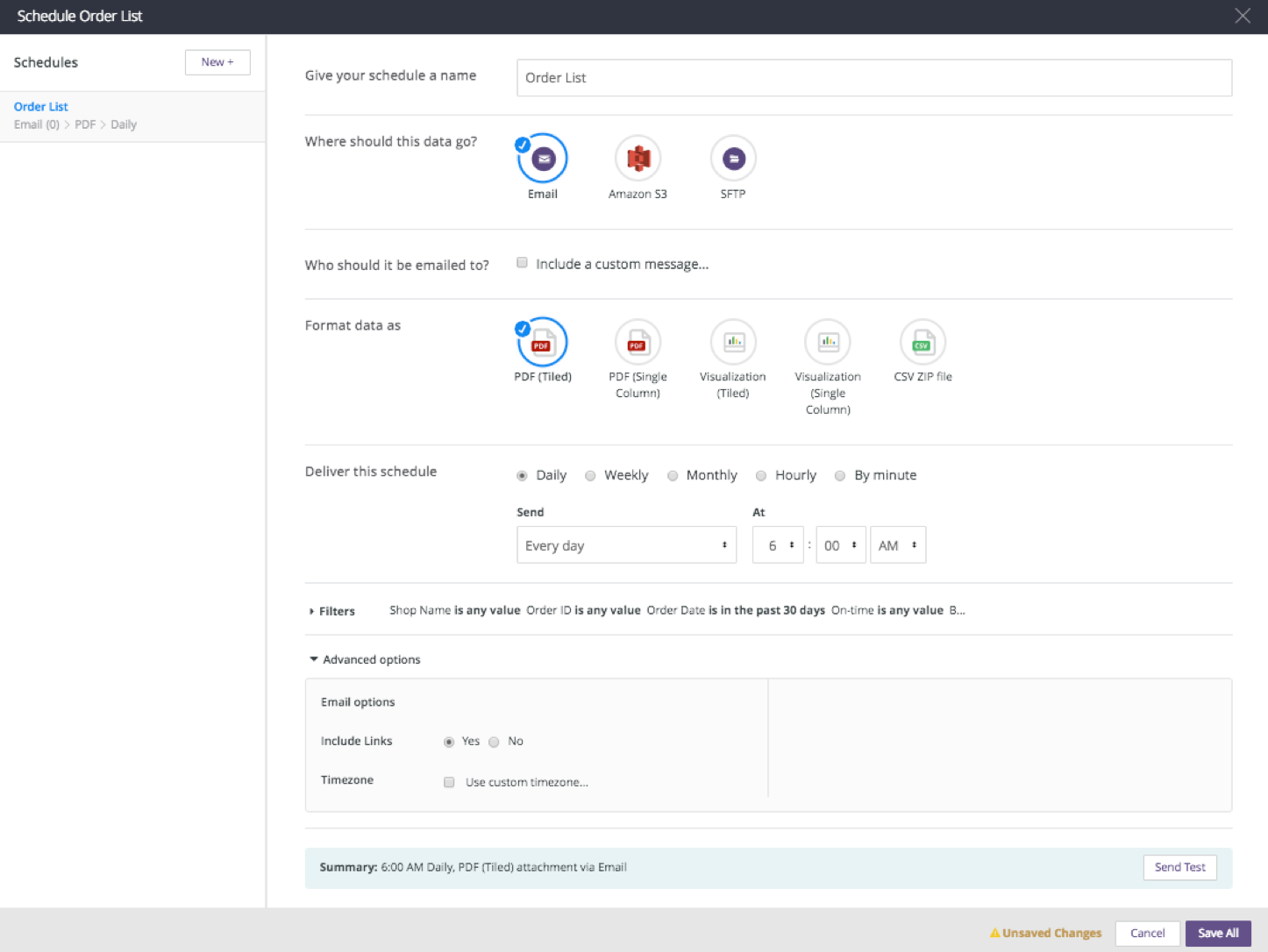 Additionally, you have the option to enable the Run schedule as recipient feature in Analytics, you can set the schedule to run for each recipient as if they ran the query themselves. You can set this in the Advanced options section as described later on this page.